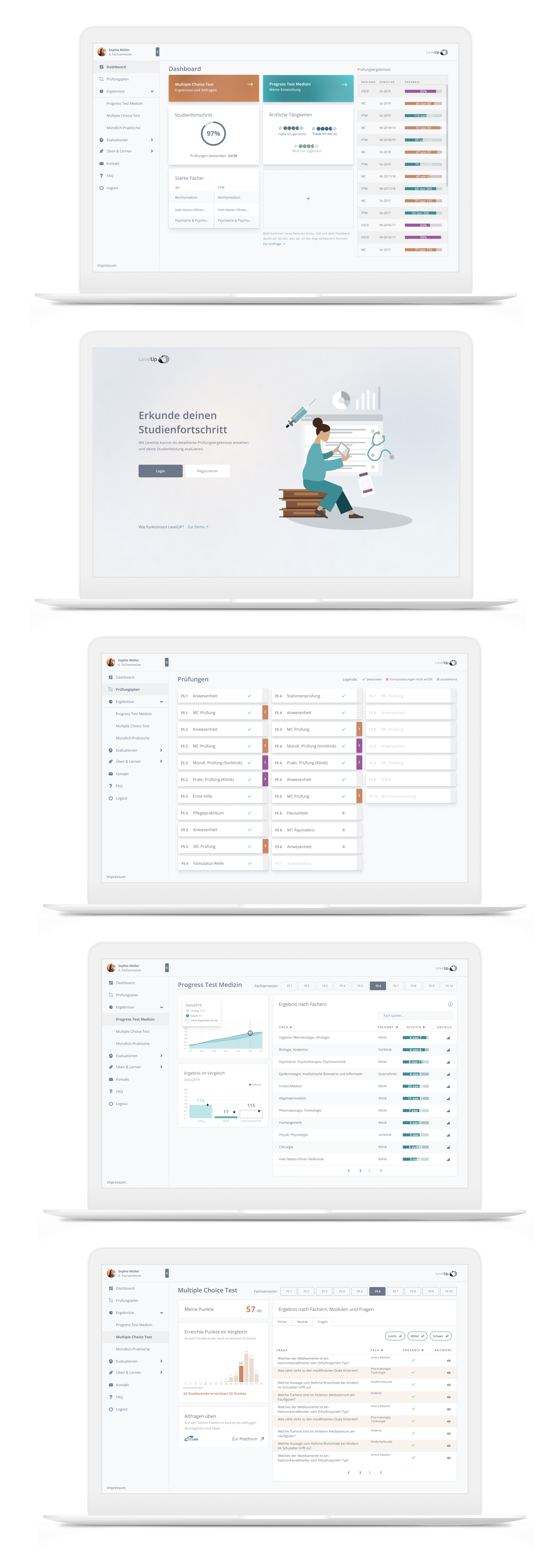 LevelUp is a web app that the university hospital Charité offers its medicine students to keep track of their study progress and check exam results. After students had complained about its difficulty of use and showed little motivation to use it, I was asked to improve it`s user experience by first defining and then finding solutions to address the pain points of the app.