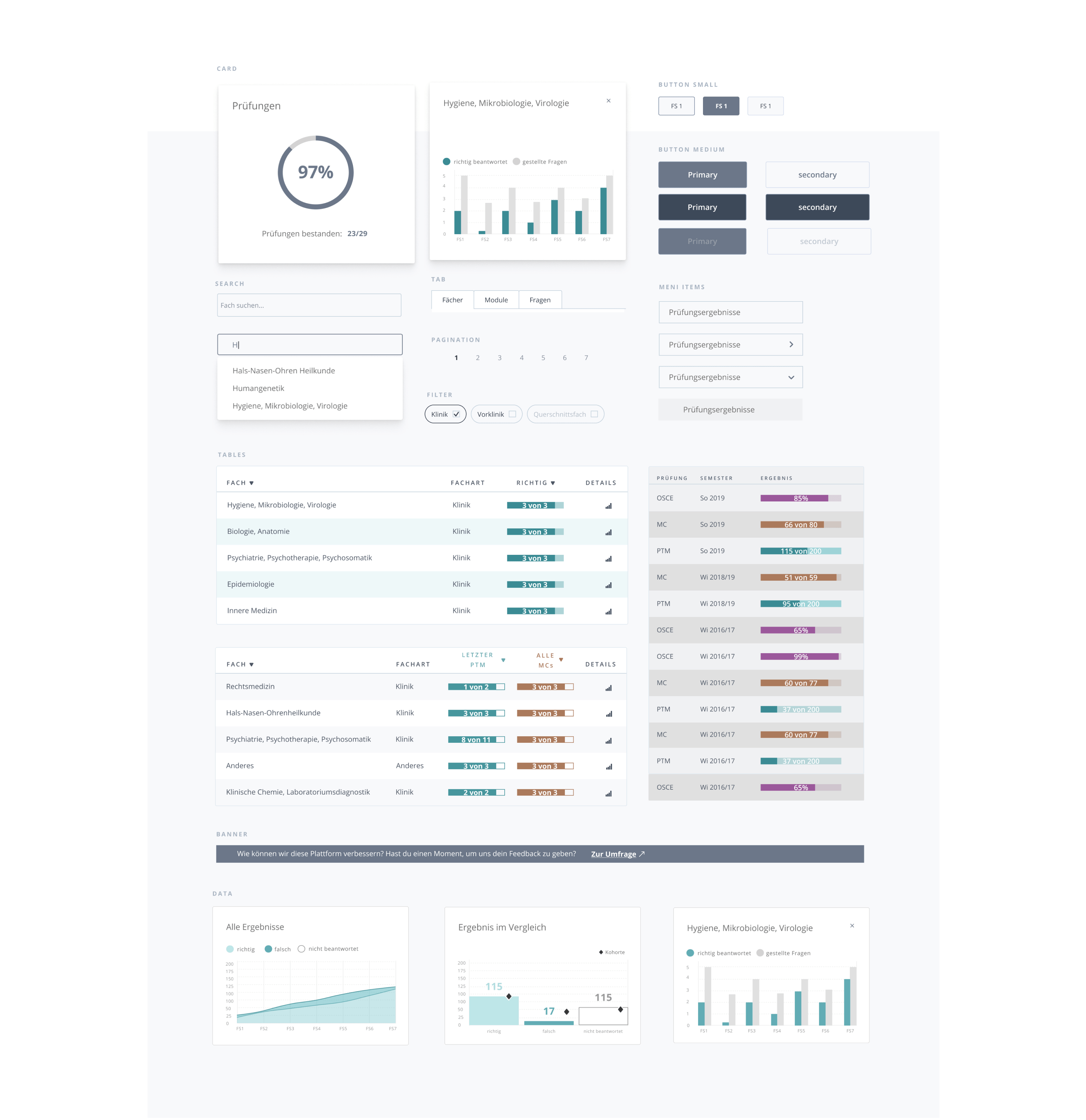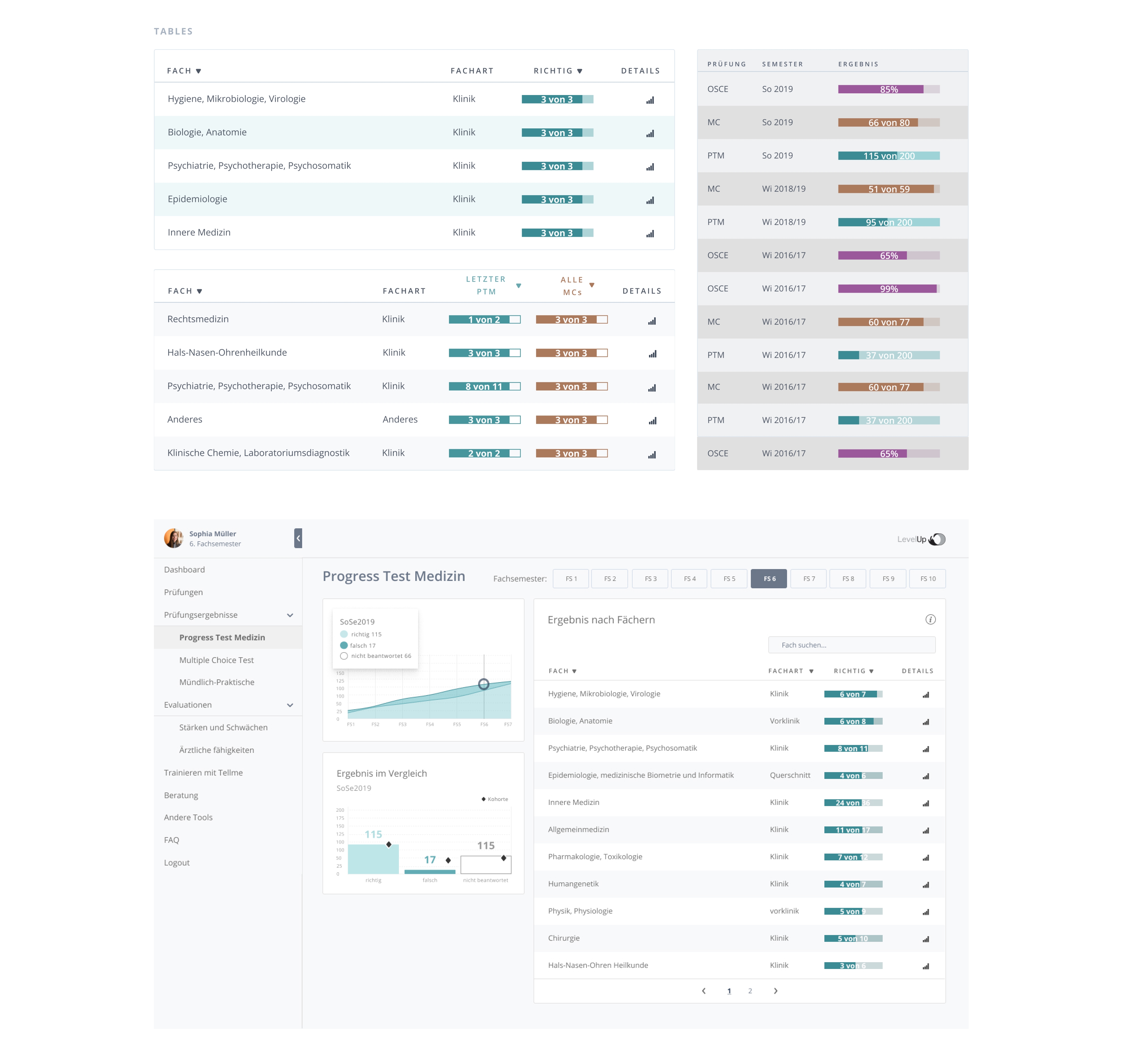 A new color palette: would denote the same color for the same data set throughout the app. Turquois stands for Progress Test Medizin, Orange-Brown for Multiple Choice Test and Purple for Results of Practical and Final exams. Like this a relationship between the data sometimes represented in different ways over different screens is created and can be recognized by the user.