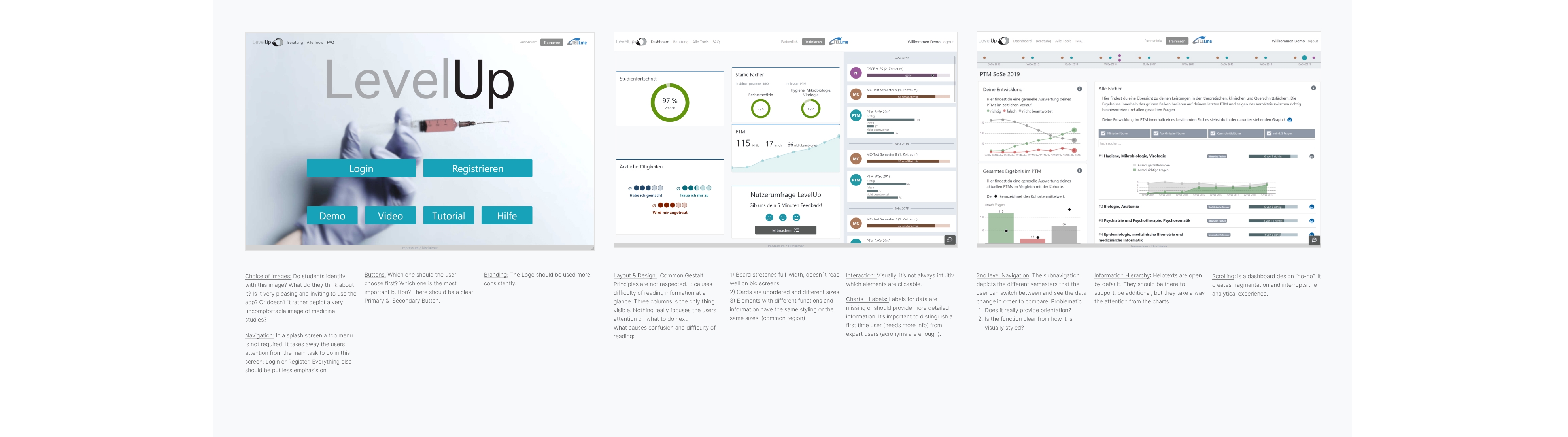 Going through the different screens, I documented the good and bad UI practices I found concerning layout, navigation structure, mobile compatibility or Call To Actions. Clearly, the app had problems with following basic Gestalt Principles that made it difficult to find information, charts were not labelled sufficiently or clearly enough for first time users, there were problems with information hierarchy of headlines, and the navigation did not offer enough orientation for the user, especially switching from one dashboard to another.