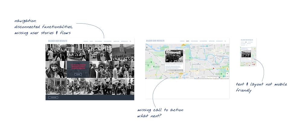 With the first exploration of ideas we were able to show possible ways of presenting and interacting with the photos: they were browsable on a timeline, located separately or along a route on a map. What was missing, though, was a concept that would put the user and her or his interest and expectations of what to do with them first.